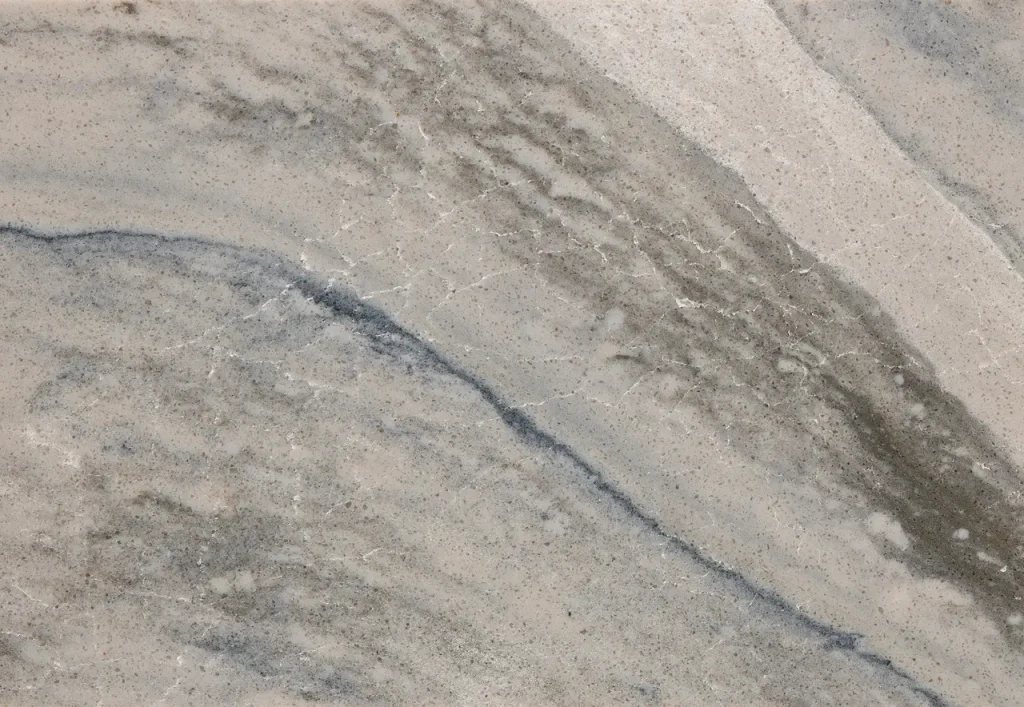 A blend of warm, cool grays and tones of taupe mix with delicate white crackling veins and subtle shades of blue that melt into the surface.